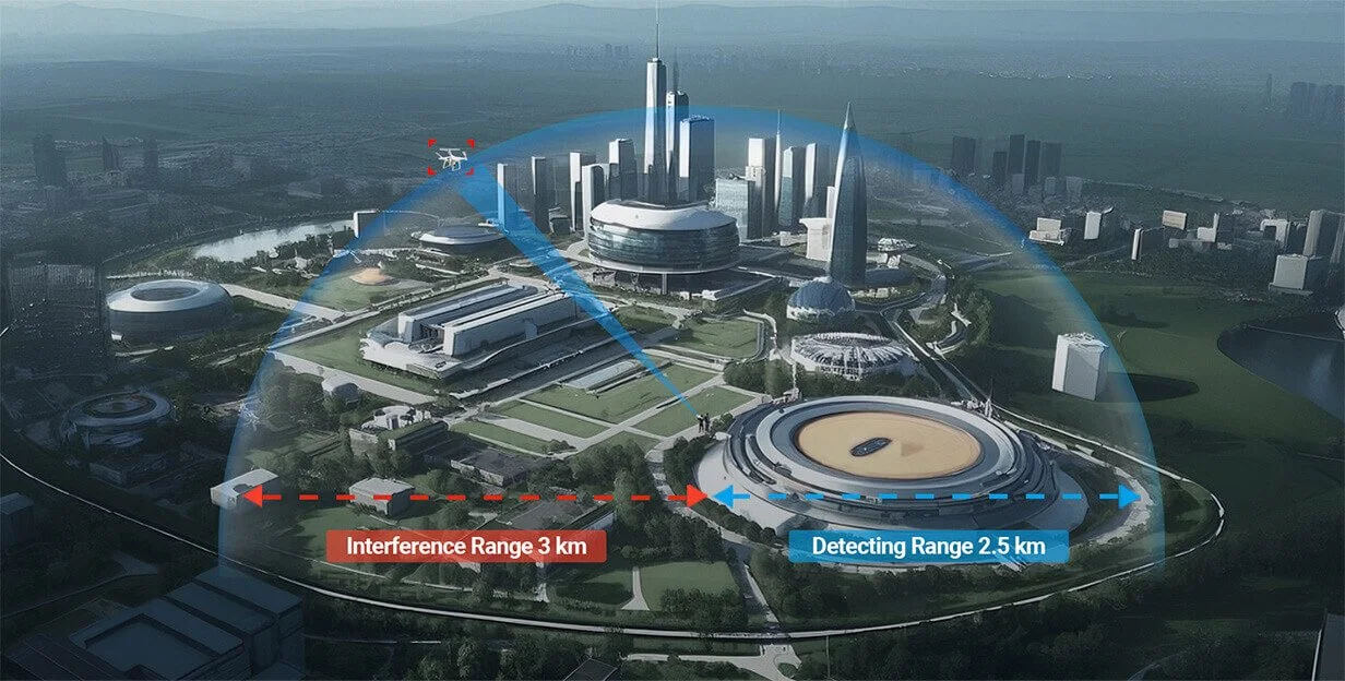 3. Intelligent Jamming Based on the detected drone model, it automatically executes countermeasure strategies and adapts frequency configurations, with a jamming range of up to 3 kilometers.